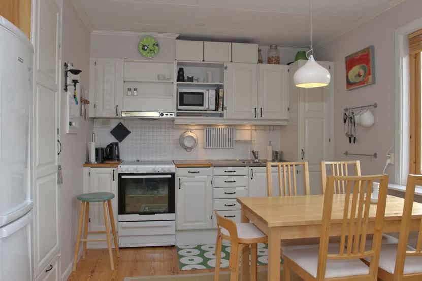 Køkkenet indeholder elkomfur med ovn, køleskab og fryser, mikro.