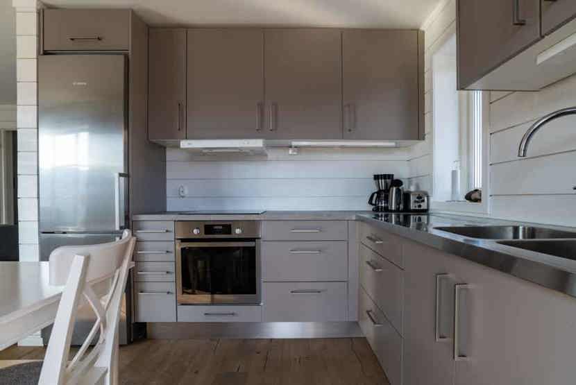 Køkkenet indeholder komfur med ovn, køleskab og fryser, opvaskemaskine, mikro.