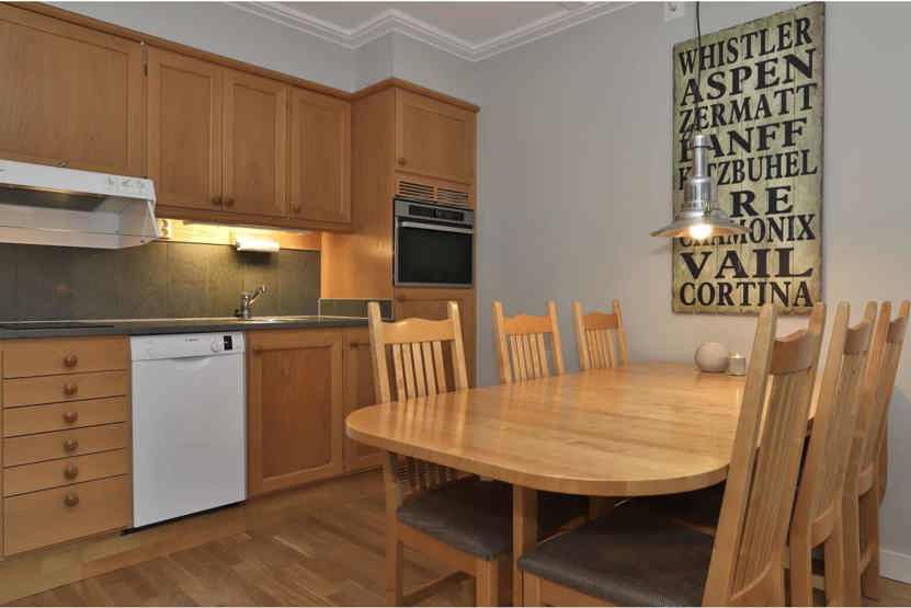 Køkkenet indeholder elkomfur med kombineret mikro-/normal ovn, køleskab med frostboks, opvaskemaskine.