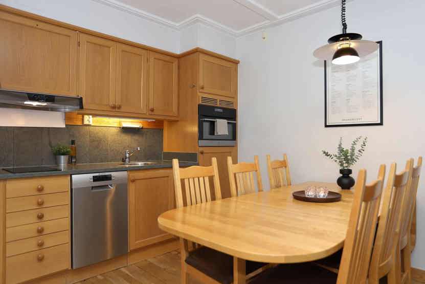 Køkkenet indeholder elkomfur med kombineret mikro-/normal ovn, køleskab med frostboks, opvaskemaskine.
