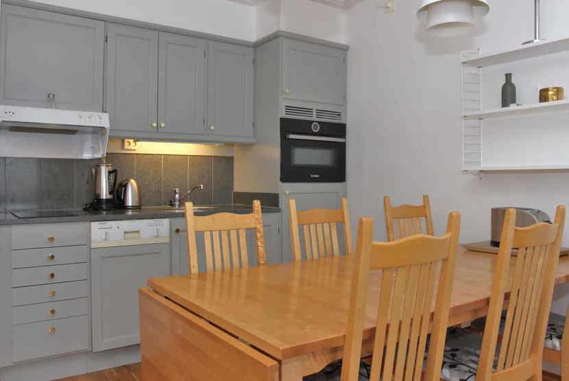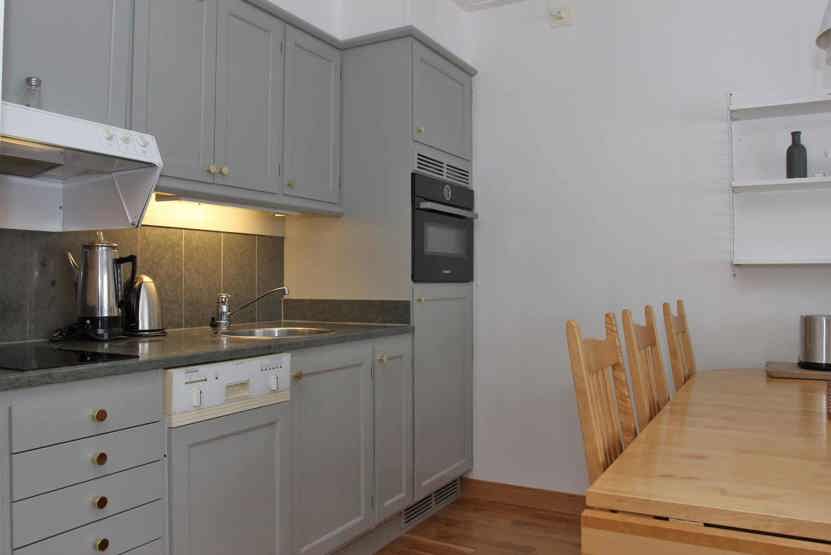 Køkkenet indeholder elkomfur med kombineret mikro-/normal ovn, køleskab med fryser, opvaskemaskine.