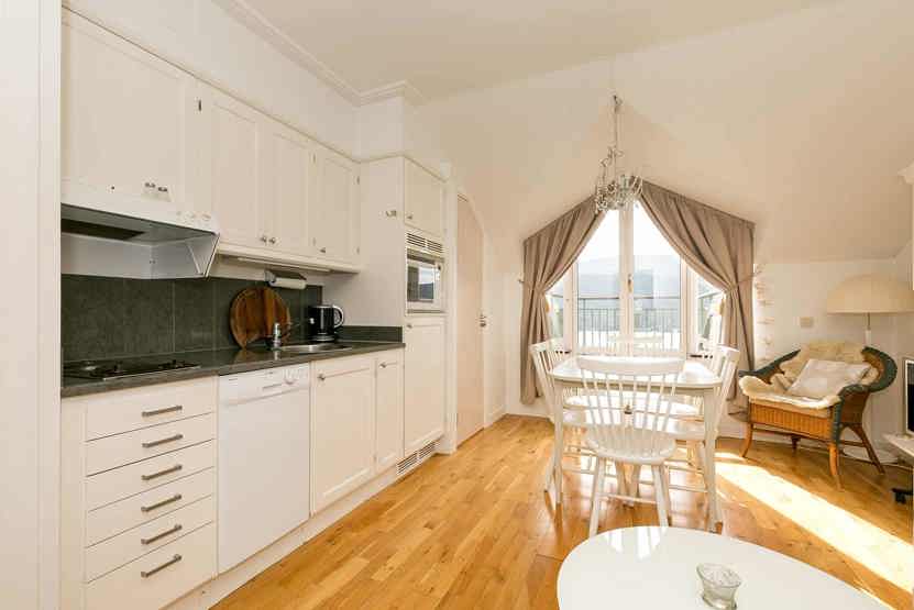 Køkkenet indeholder komfur (2 kogeplader) samt kombineret ovn/mikroovn, køleskab, opvaskemaskine.