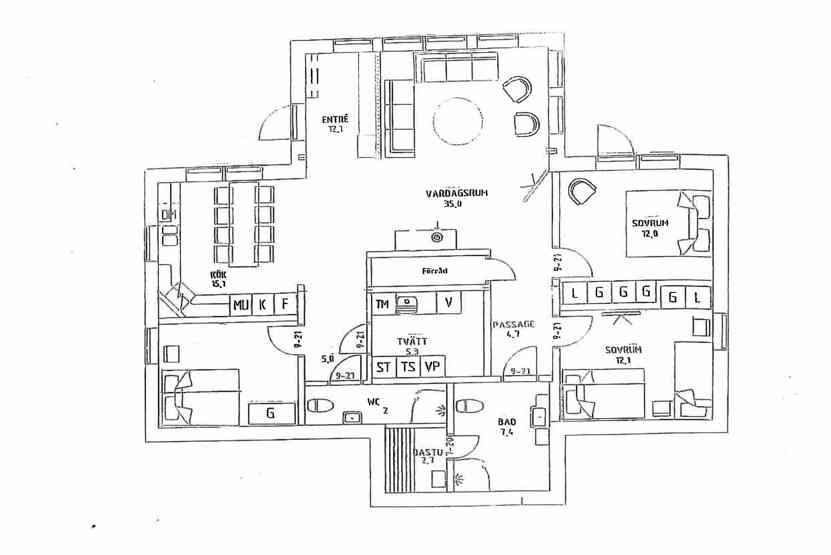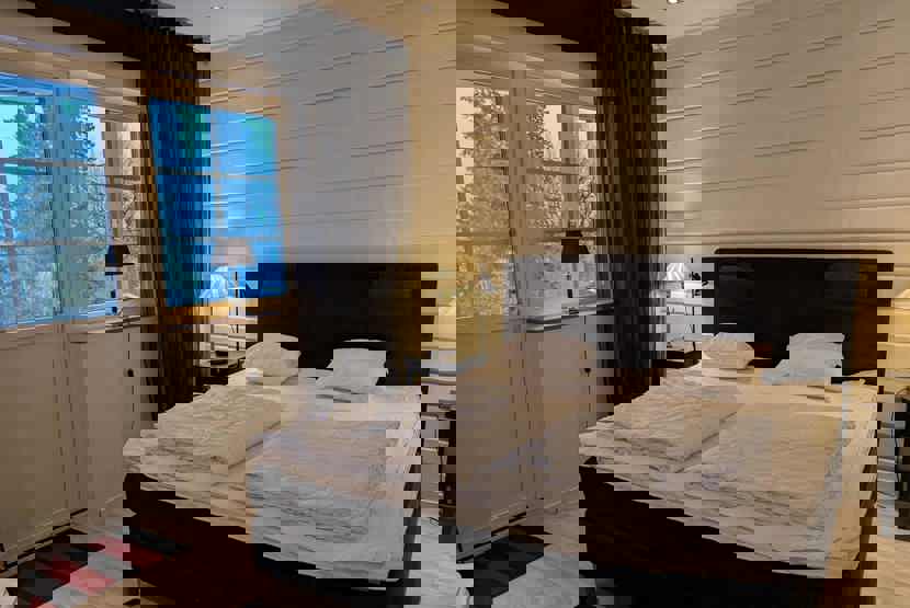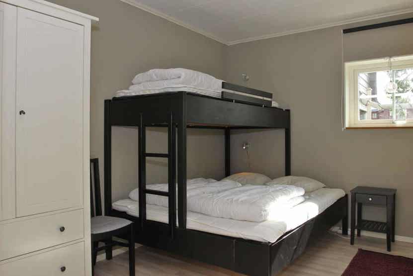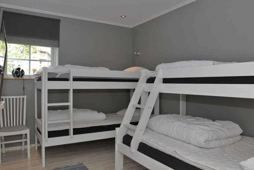 Soveværelse-1 = 1 dobbeltseng. Soveværelse-2 = 1 køyeseng med 120 cm bred underkøye og 80 cm bred overkøye, 1 køjeseng. Soveværelse-3 = 1 køjeseng med 160 cm bred underkøje.