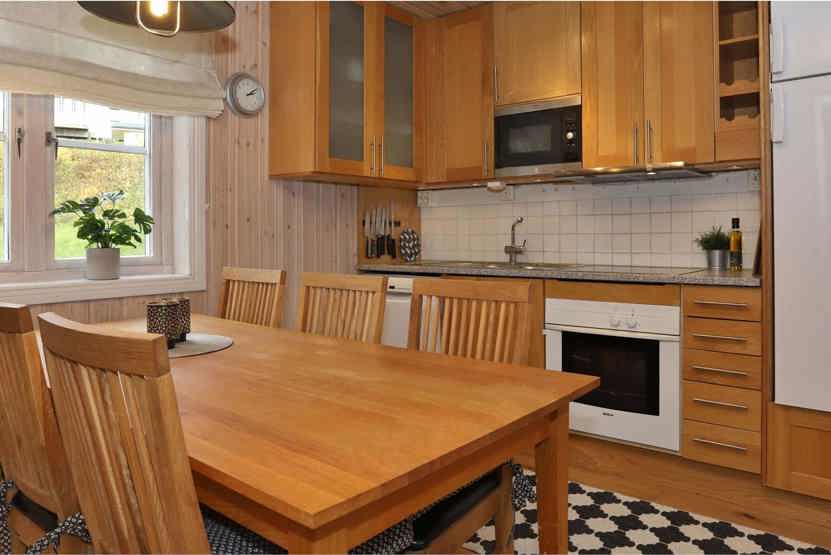 Køkkenet indeholder elkomfur med ovn, køleskab med fryser, opvaskemaskine, mikro.