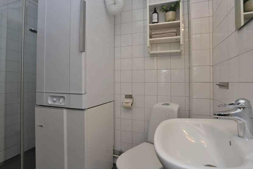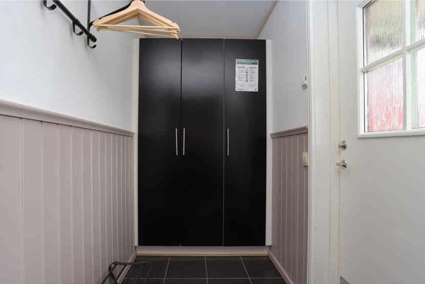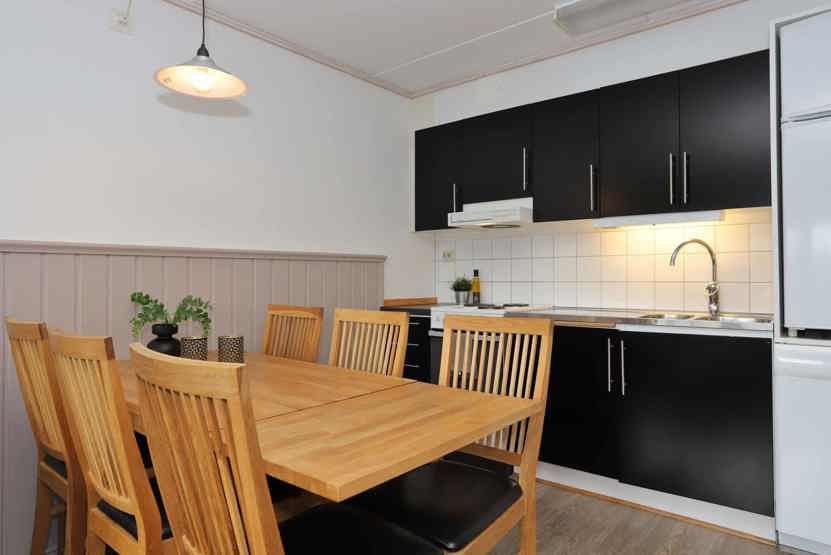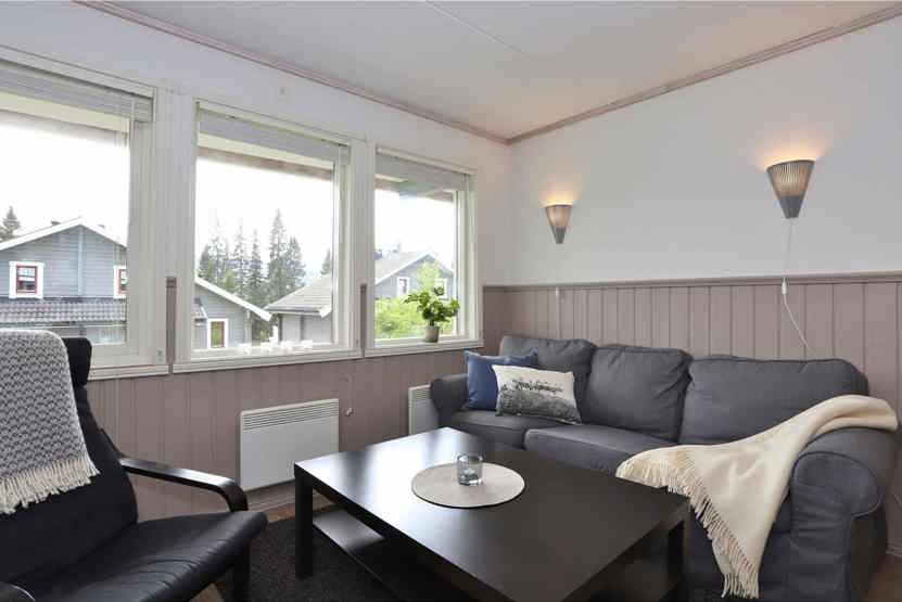 Stue med køkkenafdeling. TV, tørreskab, skiopbevaring, 1 parkeringsplads med motorvarmere.