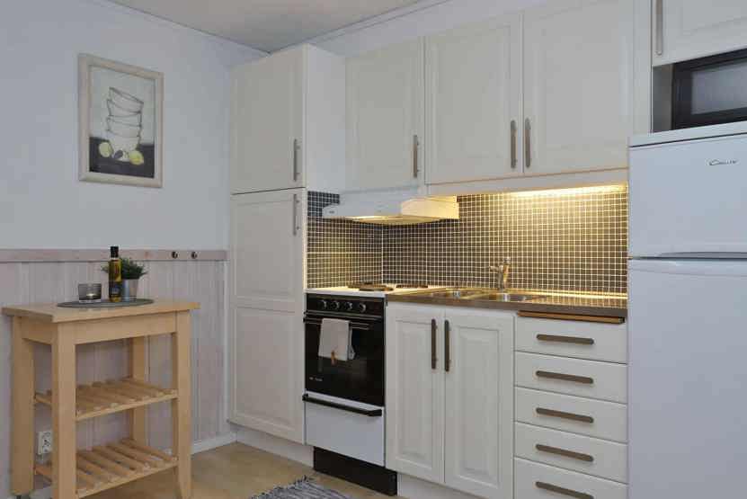 Køkkenet indeholder komfur med ovn, køleskab med fryser, mikro.