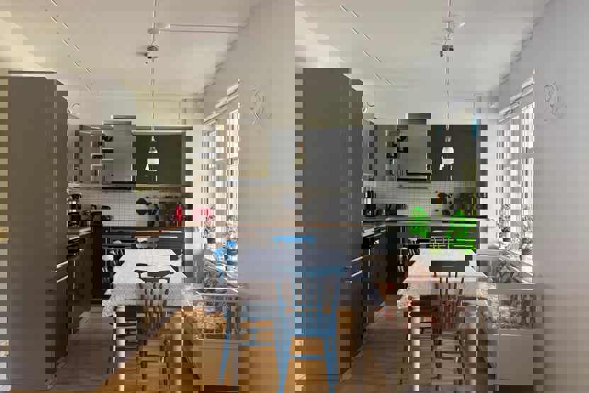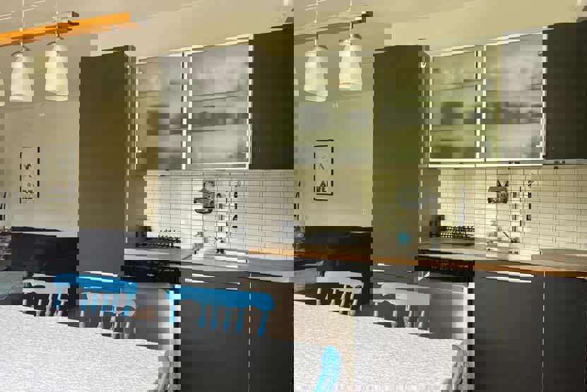 Køkkenet indeholder elkomfur med ovn, køleskab og fryser, opvaskemaskine, mikro.