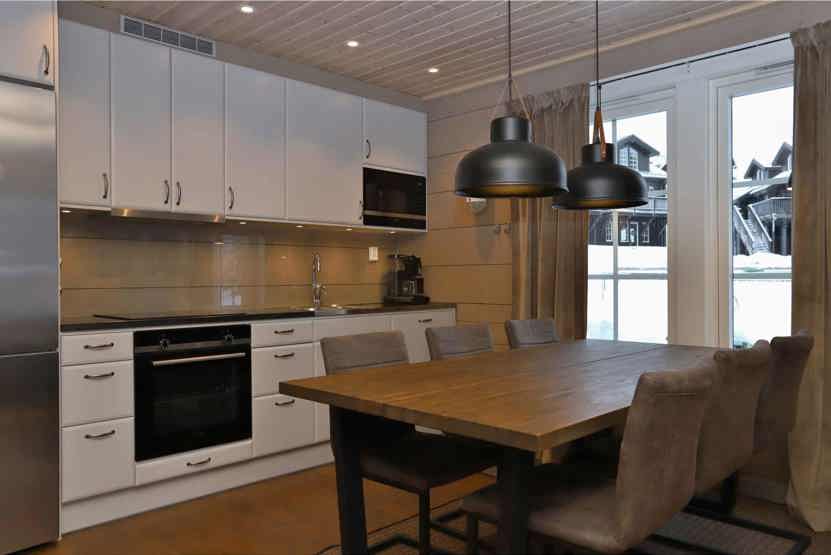 Køkkenet indeholder komfur med ovn, køleskab med fryser, opvaskemaskine, mikro.