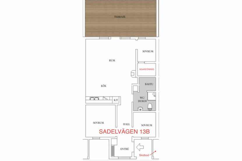 Sadelvägen ligger i Åre Björnen. Lejlighed i stueetage, 6 sengepladser, 67 kvm, alrum med køkkenafdeling, 3 soveværelse, 1 bruser, 1 WC, sauna.