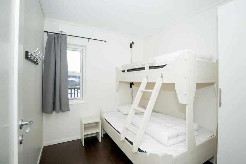 Soveværelse-1 = 1 dobbeltseng. Soveværelse-2 = 1 køjeseng med 120 cm bred underkøje og 80 cm bred overkøje. Soveværelse-3 = 1 køjeseng med 120 cm bred underkøje og 80 cm bred overkøje.