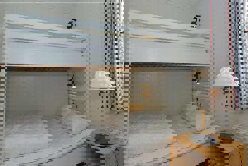 Soveværelse-1 = 1 dobbeltseng. Soveværelse-2 = 1 køjeseng med 120 cm bred underkøje og 80 cm bred overkøje. Soveværelse-3 = 1 køjeseng.