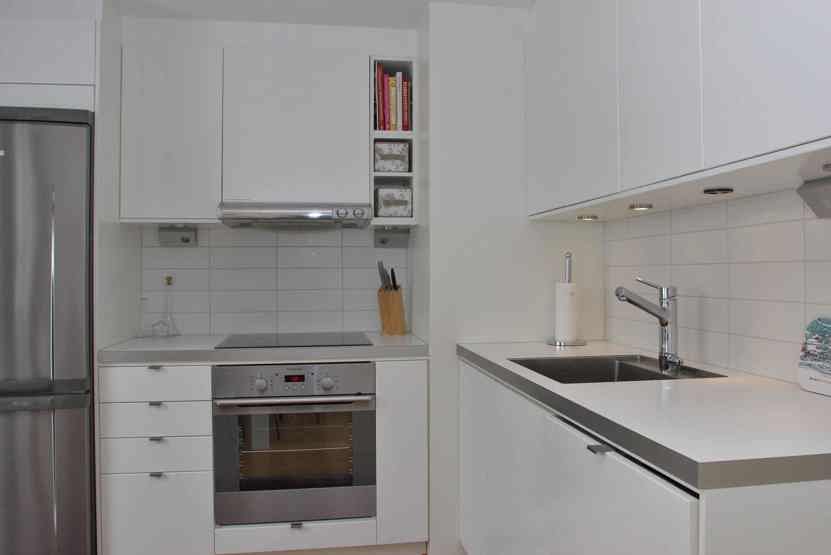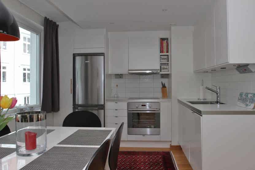 Køkkenet indeholder komfur med ovn, opvaskemaskine, køleskab med fryser, mikro.