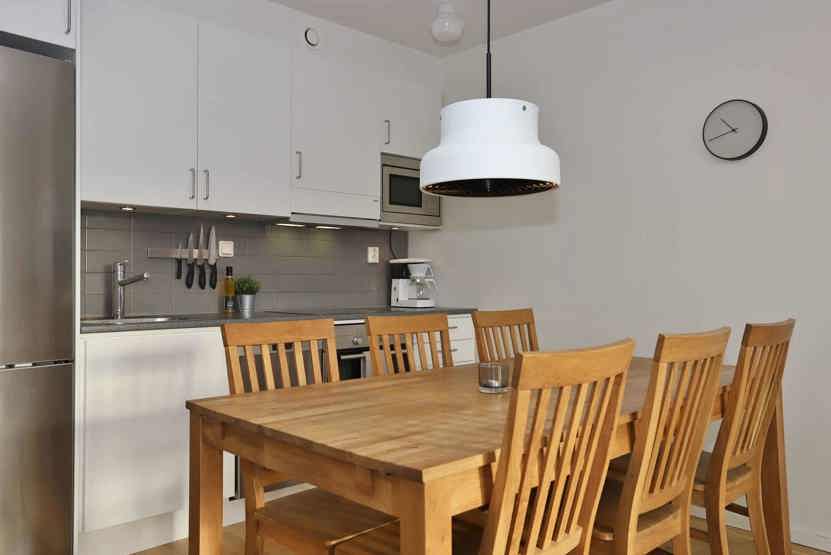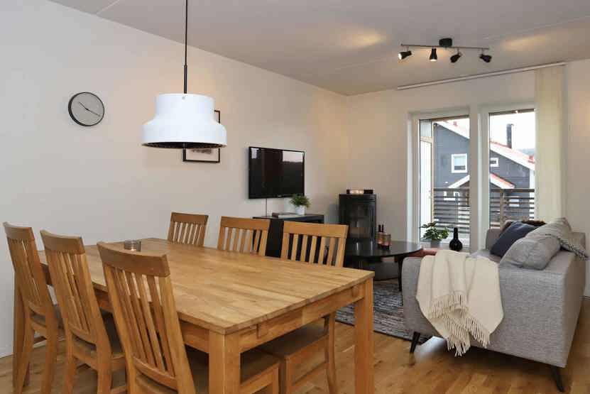TV, brændeovn (brænde indgår ikke), vaskemaskine, tørretumbler, tørreskab, altan, skiopbevaring, 1 parkeringsplads med motorvarmere.