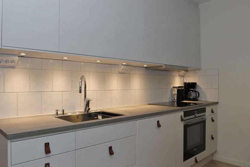 Køkkenet indeholder komfur med ovn, køleskab med fryser, opvaskemaskine, mikro.