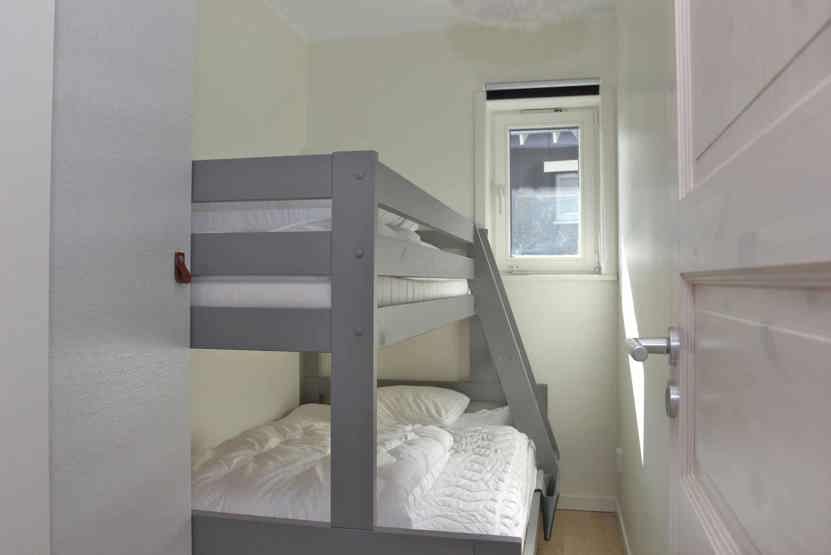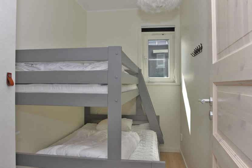 Soveværelse-1 = 1 dobbeltseng 160 cm bred. Soveværelse-2 = 1 køyeseng med 120 cm bred underkøye og 90 cm bred overkøye. Soveværelse-3 = 1 køyeseng med 120 cm bred underkøye og 90 cm bred overkøye.