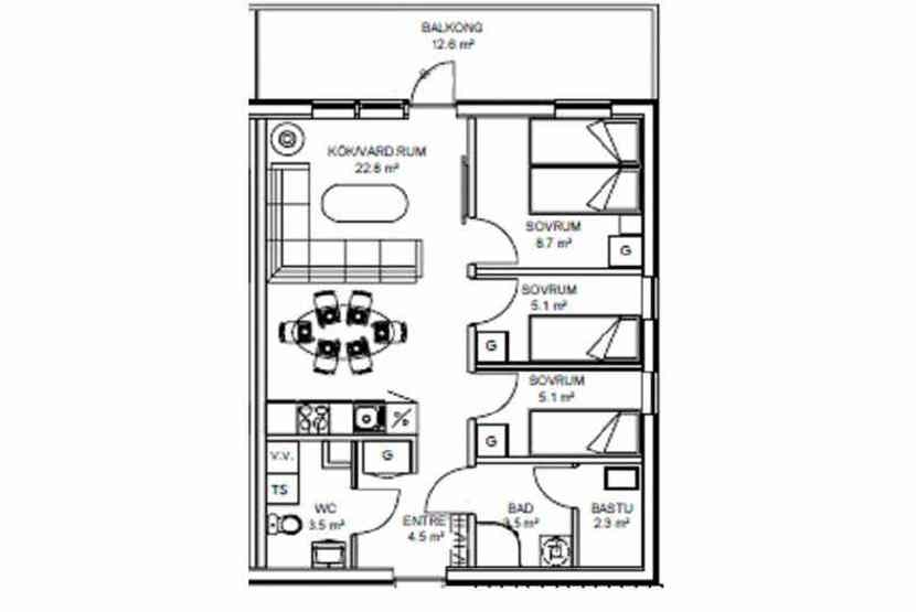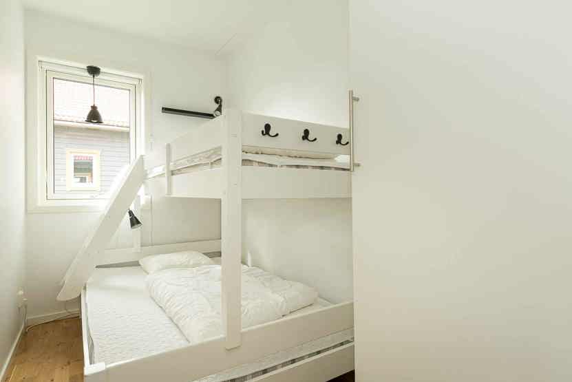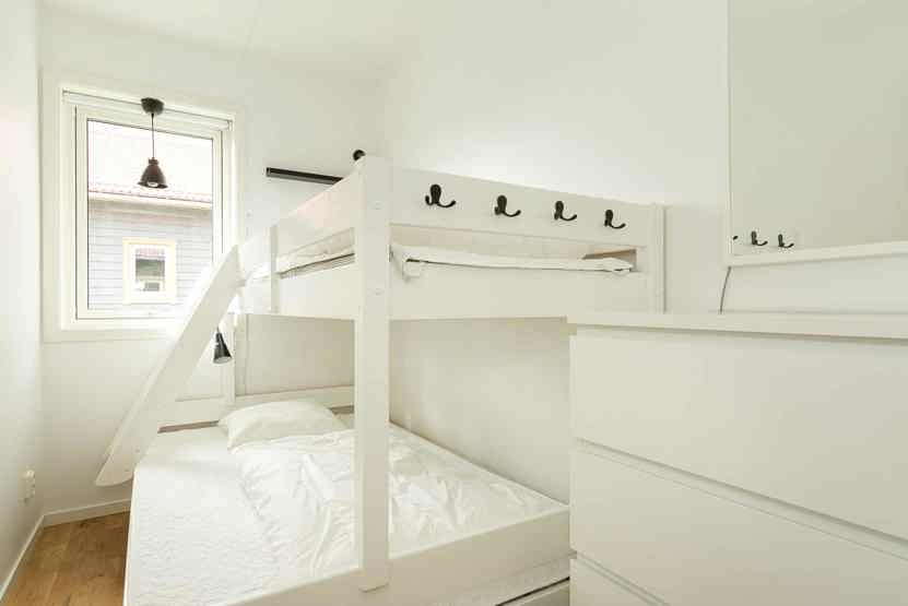 Soveværelse-1 = 1 dobbeltseng. Soveværelse-2 = 1 køjeseng med 120 cm bred underkøje. Soveværelse-3 = 1 køjeseng med 120 cm bred underkøje.