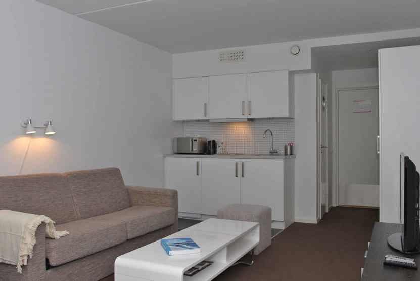 Stue med køkkenafdeling, sovesofa til 2 personer.