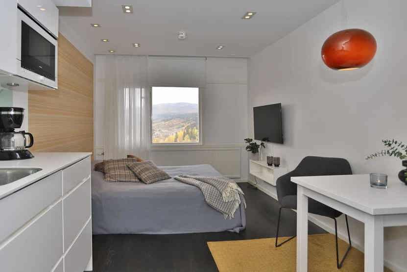 Tott Apartments ligger i Åre By. Studio på 3 etage, 2 sengepladser, 21 kvm, alrum med kombineret sove- og køkkenafdeling, 1 bruser, 1 WC.