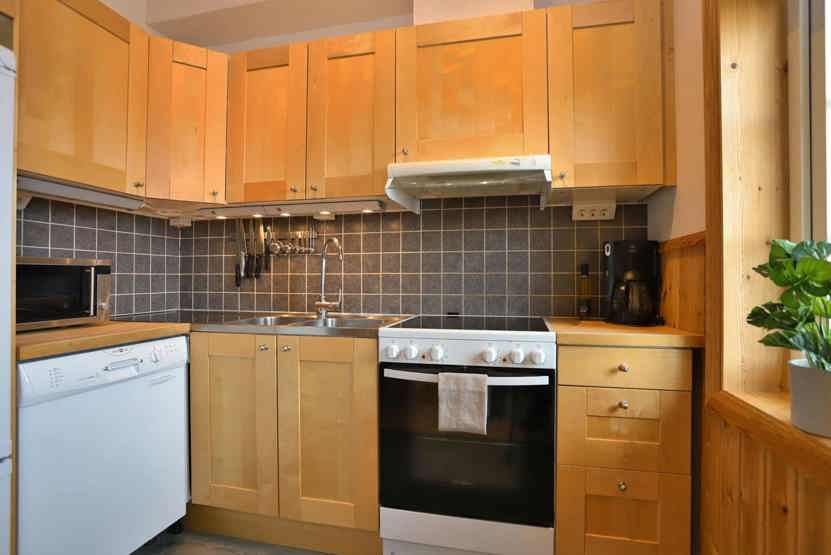 Køkkenet indeholder elkomfur med ovn, køleskab og fryser, opvaskemaskine, mikro.