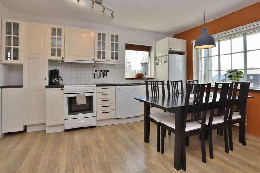 Køkkenet indeholder elkomfur med ovn, køleskab og fryser, opvaskemaskine, mikro.