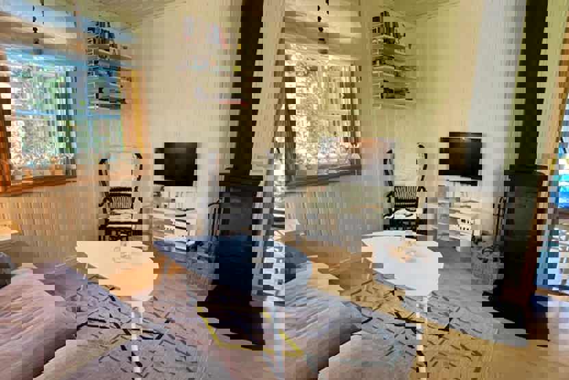 TV, brændeovn (brænde indgår ikke), tørreskab, altan, skiopbevaring, 1 parkeringsplads med motorvarmere.