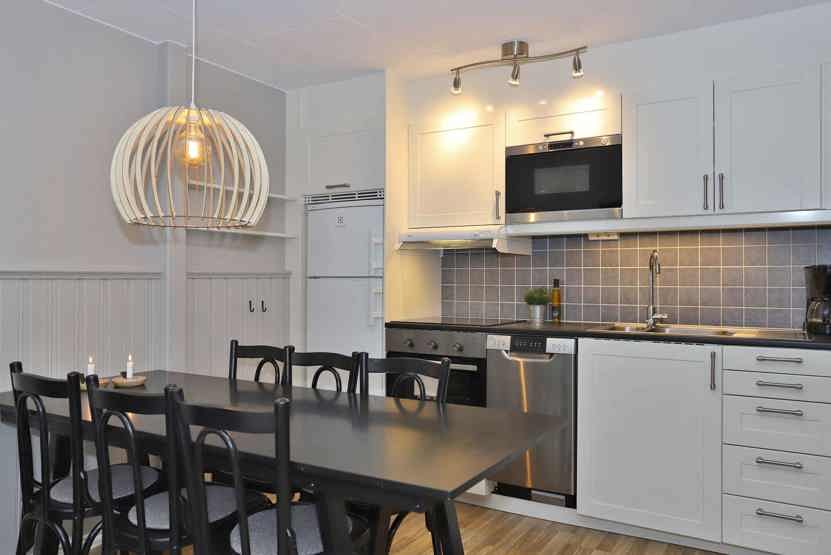 Køkkenet indeholder elkomfur med ovn, køleskab med fryser, opvaskemaskine, mikro.