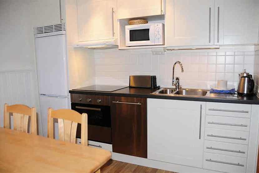 Køkkenet indeholder elkomfur med ovn, køleskab med fryser, opvaskemaskine, mikro.