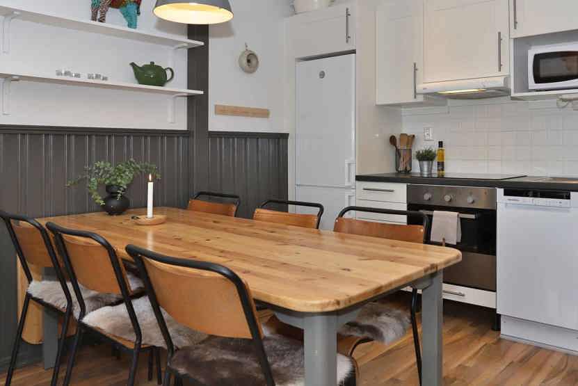 Køkkenet indeholder elkomfur med ovn, køleskab med fryser, opvaskemaskine, mikro.