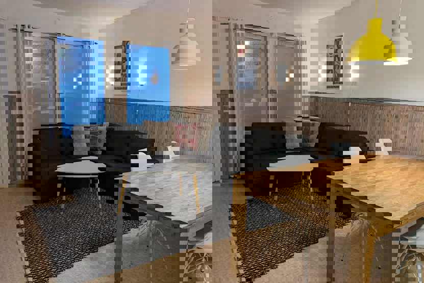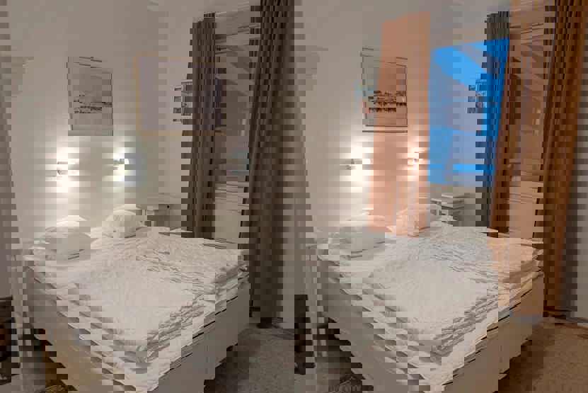 Soveværelse-1 = 1 dobbeltseng 180 cm bred. Soveværelse-2 = 1 køjeseng med 105 cm bred underkøje og 80 cm bred overkøje.