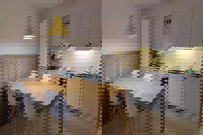Køkkenet indeholder elkomfur med ovn, køleskab med fryser, opvaskemaskine, mikro.