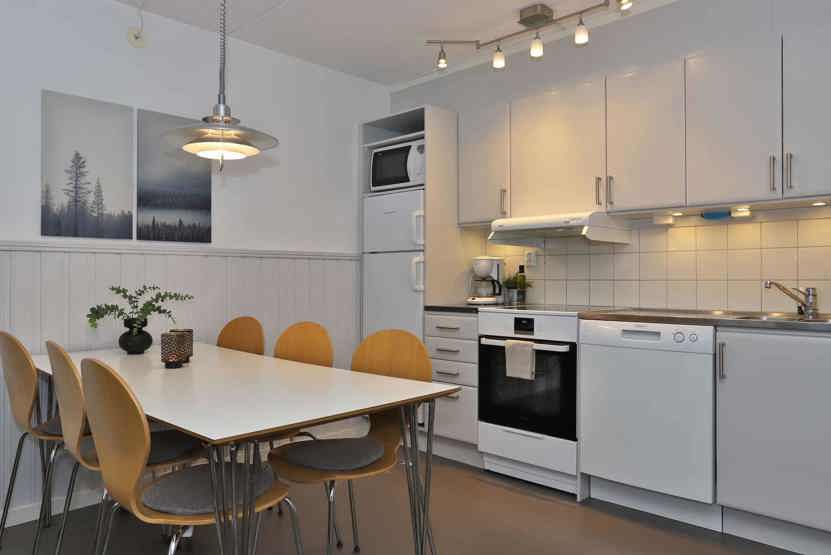 Køkkenet indeholder Induktionskomfur, køleskab og fryser, opvaskemaskine, mikro.