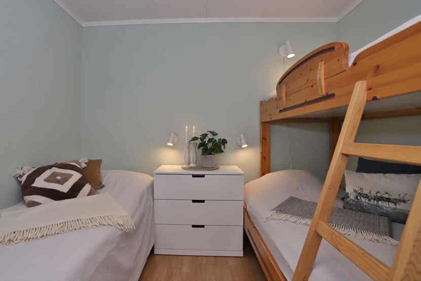 Soveværelse-1 = 1 dobbeltseng 160 cm bred. Soveværelse-2 = 1 køjeseng med 105 cm bred underkøje, 1 enkeltseng.
