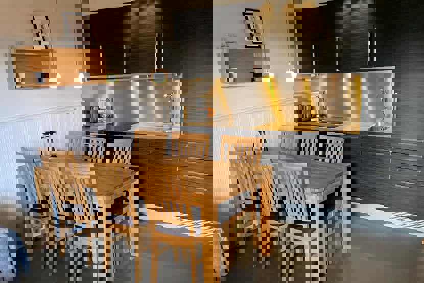 Køkkenet indeholder elkomfur med ovn, køleskab med frostboks, opvaskemaskine.
