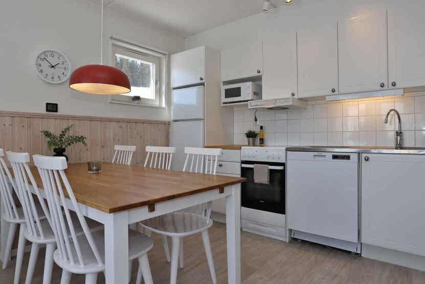 Køkkenet indeholder mikro, elkomfur med ovn, køleskab med fryser, opvaskemaskine.