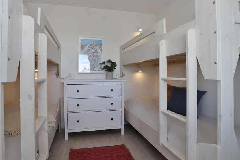 Soveværelse-1 = 1 dobbeltseng 160 cm bred. Soveværelse-2 = 2 køjesenge hvor både over og underkøje er 80 cm bred.