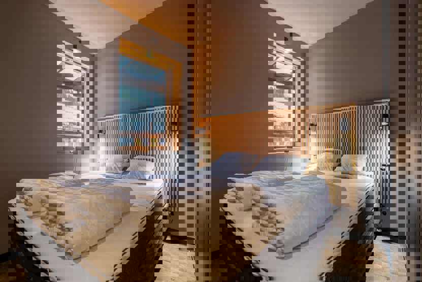 Soveværelse-1 = 1 dobbeltseng 180 cm bred. Soveværelse-2 = 1 køjeseng hvor både over og underkøje er 90 cm bred.