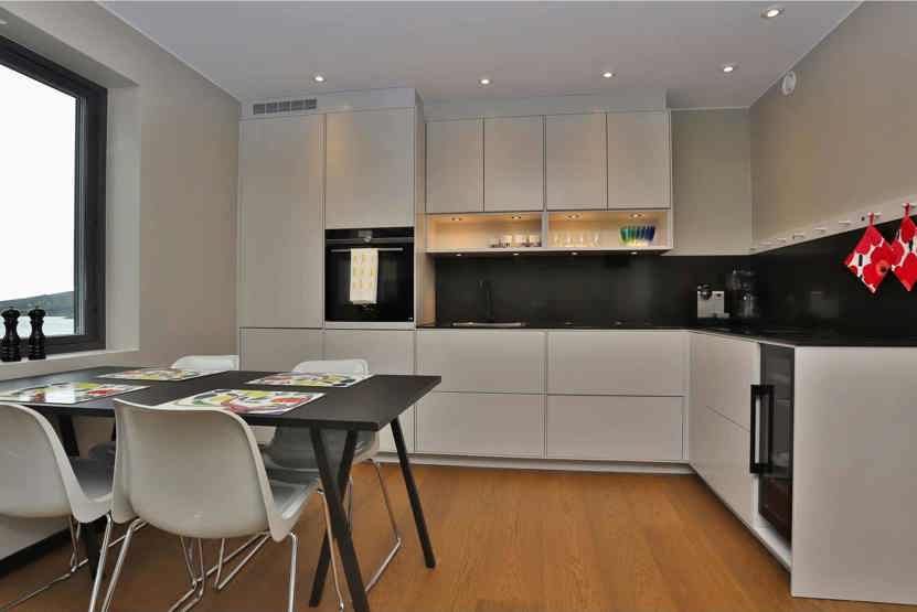 Køkkenet indeholder komfur med ovn, opvaskemaskine, køleskab med fryser, mikro.