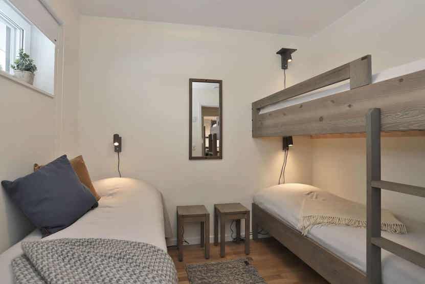 Soveværelse-1 = 1 dobbeltseng 180 cm bred. Soveværelse-2 = 1 enkeltseng, 1 køjeseng. Soveværelse-3 = 1 køjeseng med 120 cm bred underkøje og 80 cm bred overkøje.
