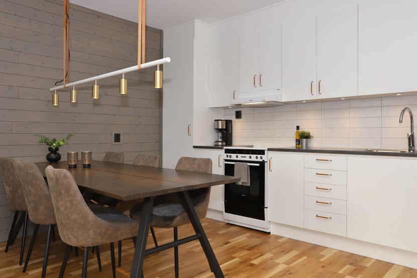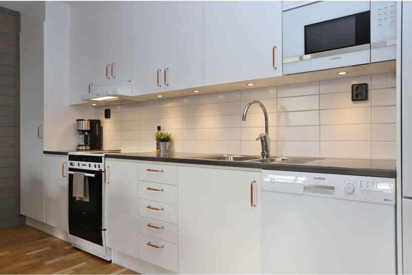 Køkkenet indeholder komfur med ovn, køleskab med fryser, opvaskemaskine, mikro.