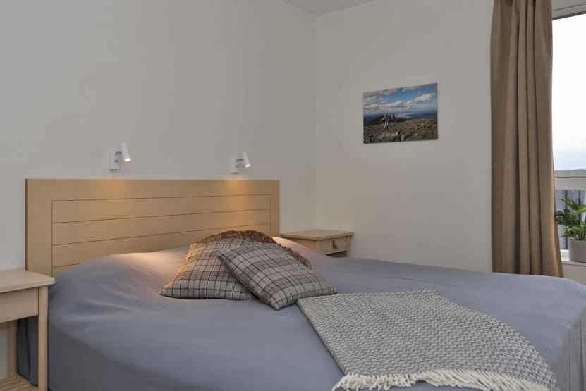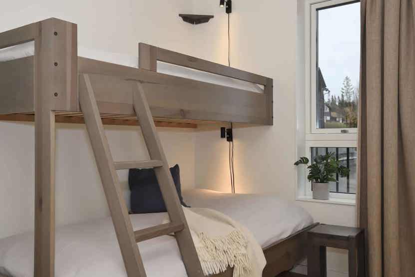 Soveværelse-1 = 1 køjeseng med 120 cm bred underkøje og 80 cm bred overkøje. Soveværelse-2 = 2 enkeltsenge 90 cm bred. Soveværelse-3 = 2 enkeltsenge 90 cm bred. Soveværelse-4 = 2 enkeltsenge 90 cm bred.