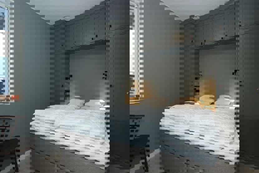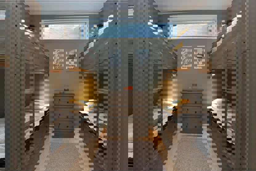 Soveværelse-1 = 1 dobbeltseng 160 cm bred. Soveværelse-2 = 2 køjesenge hvor både over og underkøje er 90 cm bred.