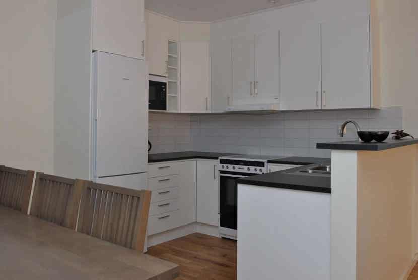 Køkkenet indeholder komfur med ovn, køleskab og fryser, opvaskemaskine, mikro.