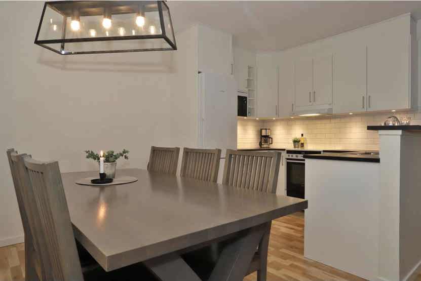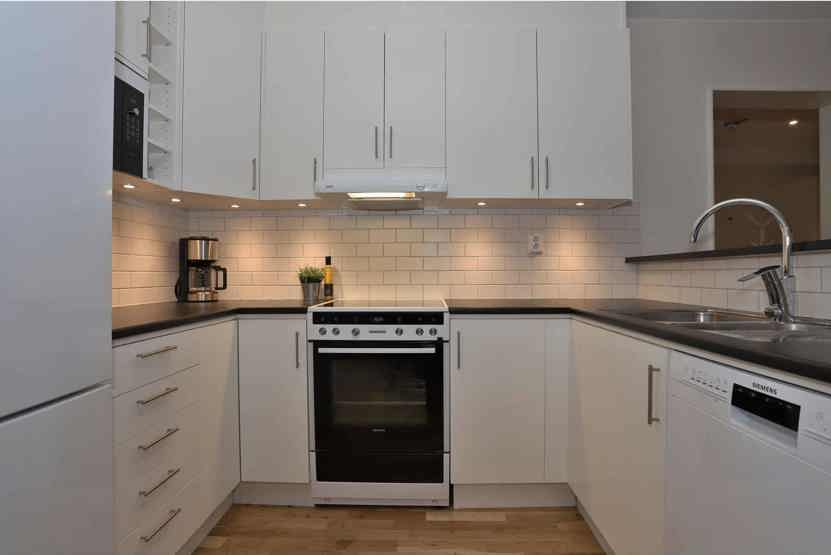 Køkkenet indeholder komfur med ovn, køleskab med fryser, opvaskemaskine, mikro.
