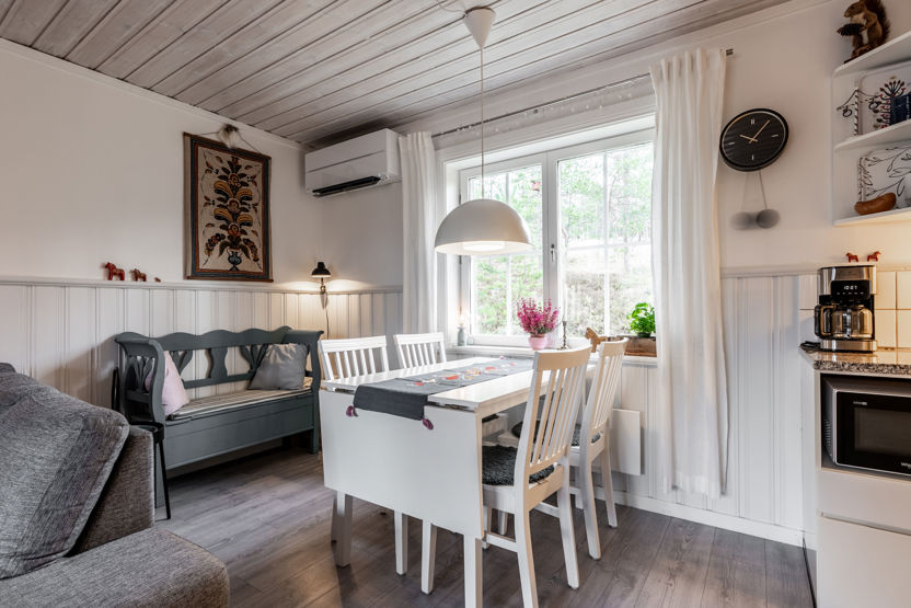 Pænt dobbelthus i Dalsbyn med plads til op til 6 personer. Her er det en åben planløsning med køkkenafdeling, spiseplads, tv-hjørne, sovesofa til én person og en brændeovn, der skaber en hyggelig atmosfære. Soveværelse 1 har en køjeseng med dobbeltseng, soveværelse 2 har en køjeseng.