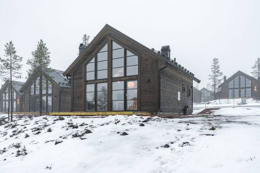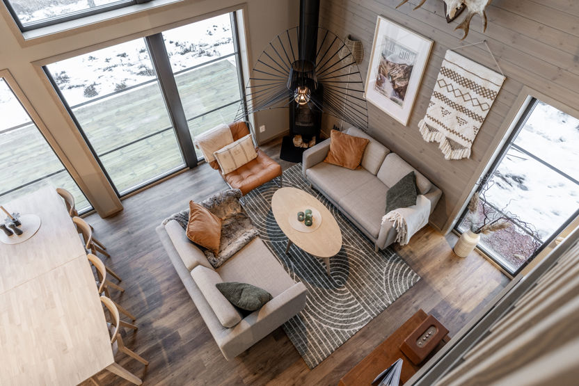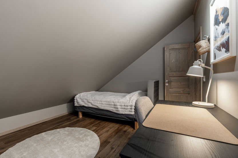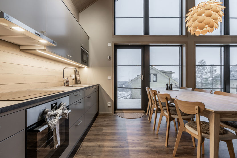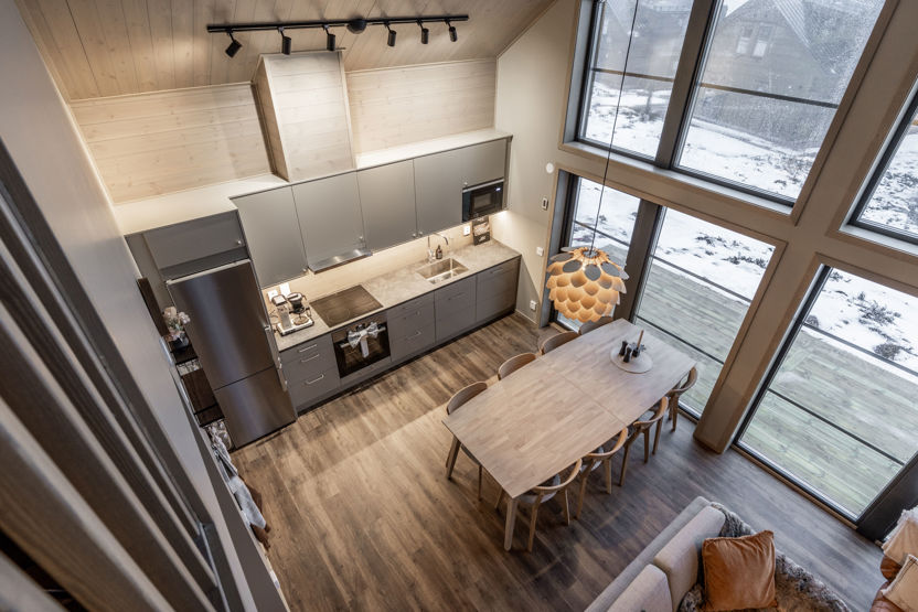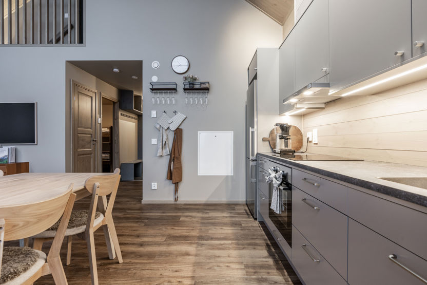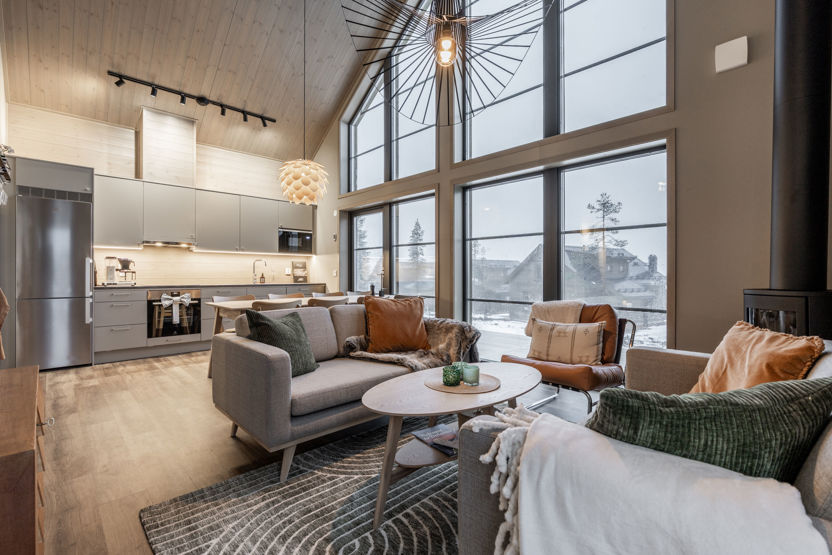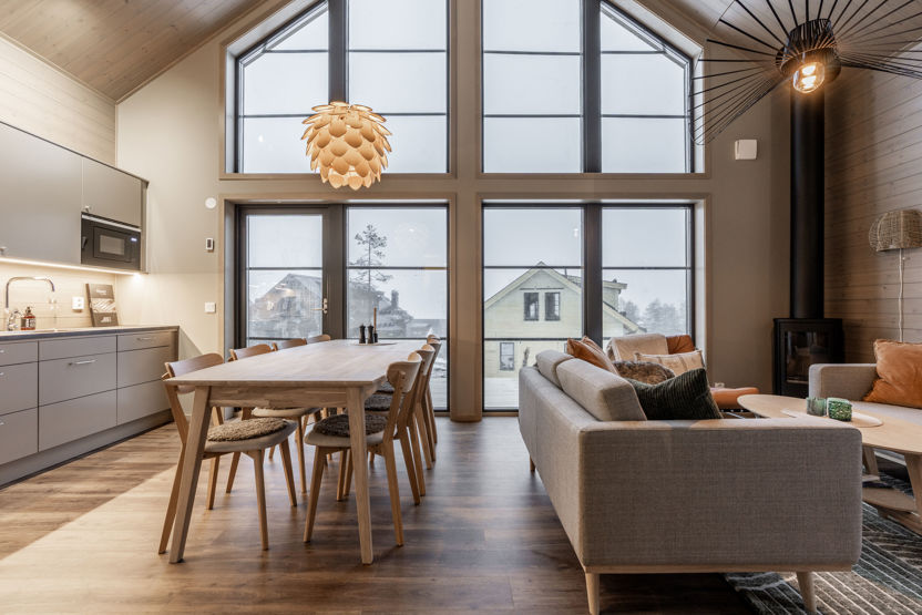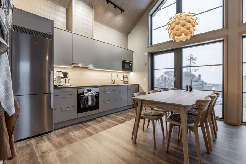 Köket är utrustat med kyl och frys. I allrummet finns matplats och bekväma sittmöbler med gott om utrymme för gemensamma stunder framför braskaminen efter en aktiv dag utomhus.
