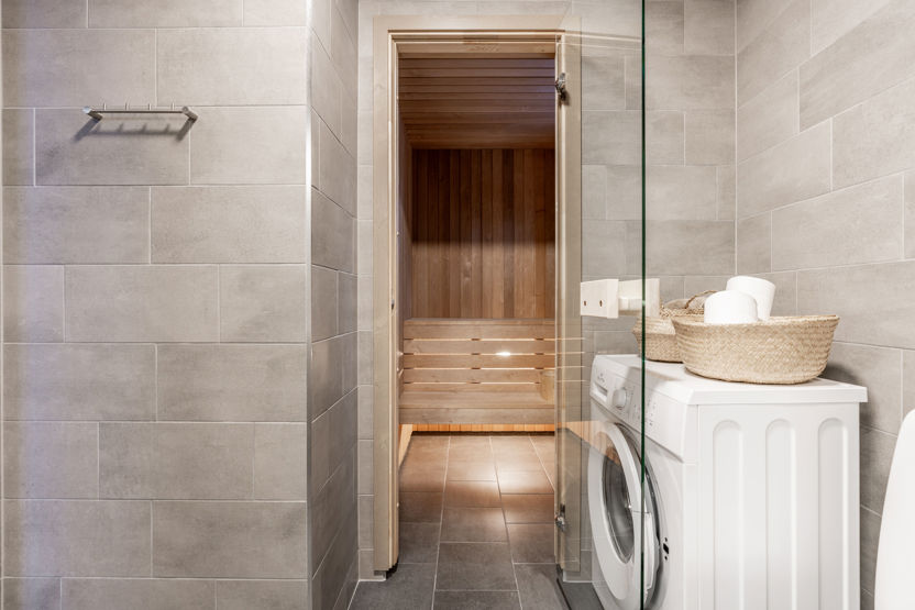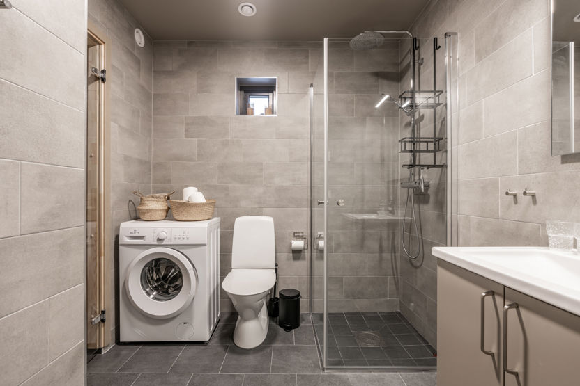 I stugan finns 1 badrum med dusch och wc samt bastu för avkoppling efter dagens aktiviteter. Här finns även tvättmaskin.