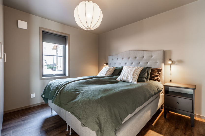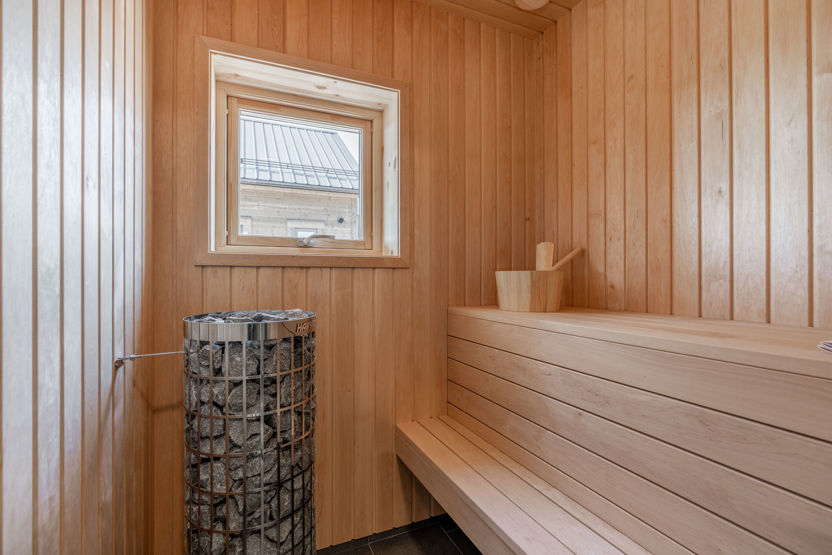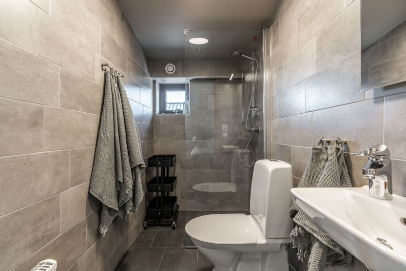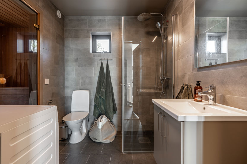 Stugan har 2 badrum, båda med dusch. I anslutning till ett av badrummen finns bastu som inbjuder till avkoppling samt tvättmaskin för extra bekvämlighet.