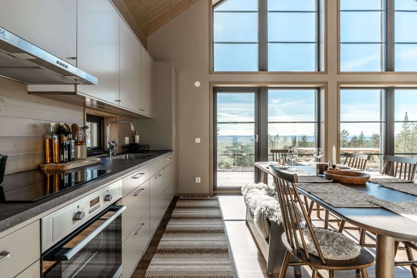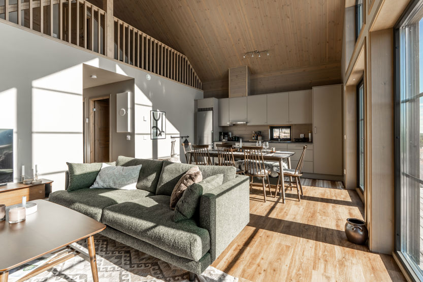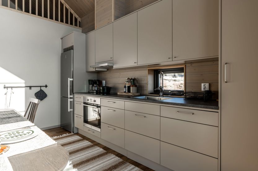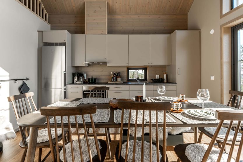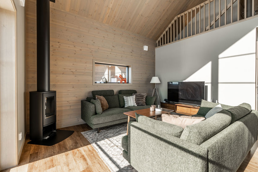 Köket är välutrustat med diskmaskin, kyl och frys. Intill finns matplats och en trivsam social yta där du kan koppla av framför braskaminen efter en dag utomhus.