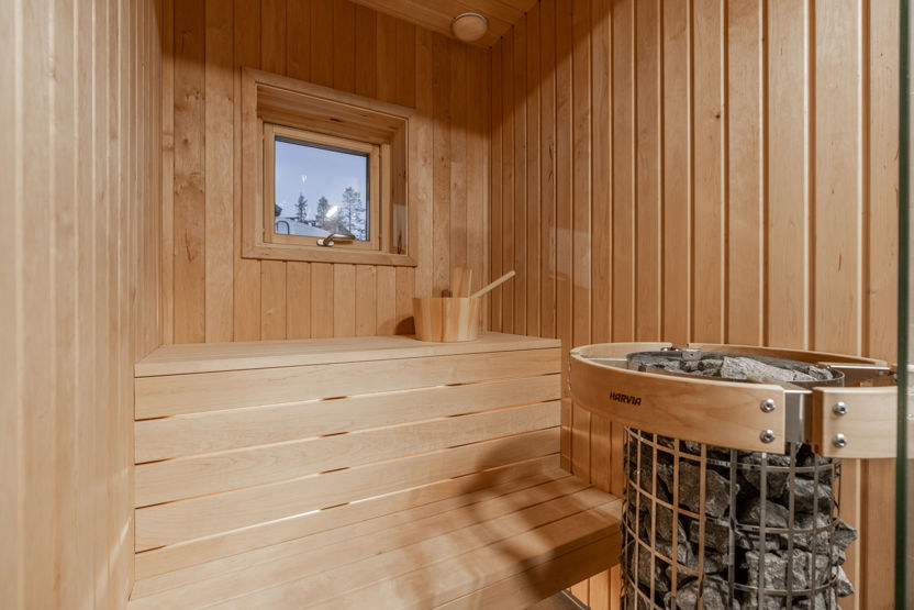 Badrummet har dusch, tvättmaskin och bastu med ingång från badrummet.