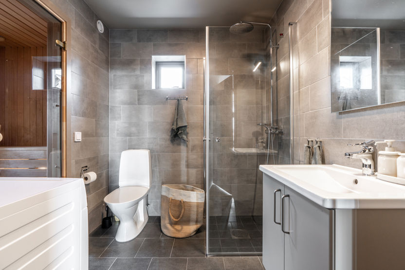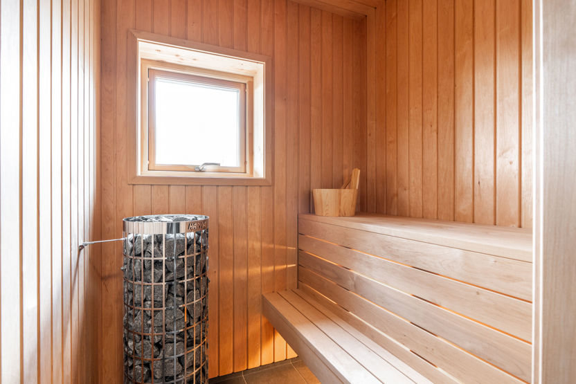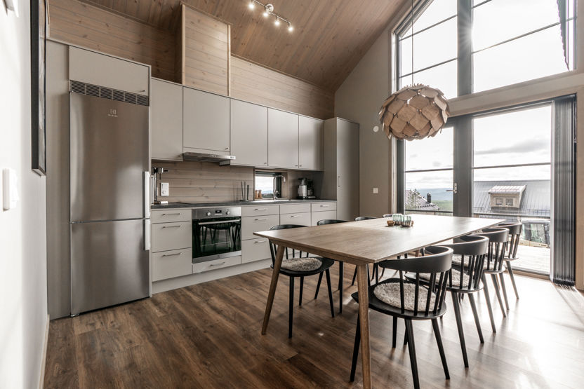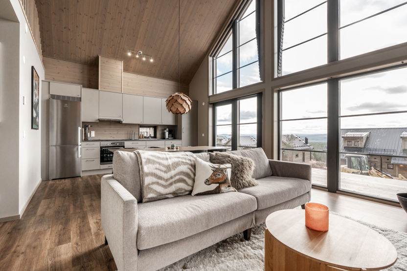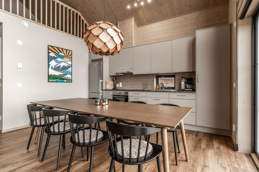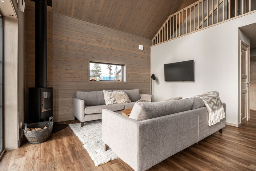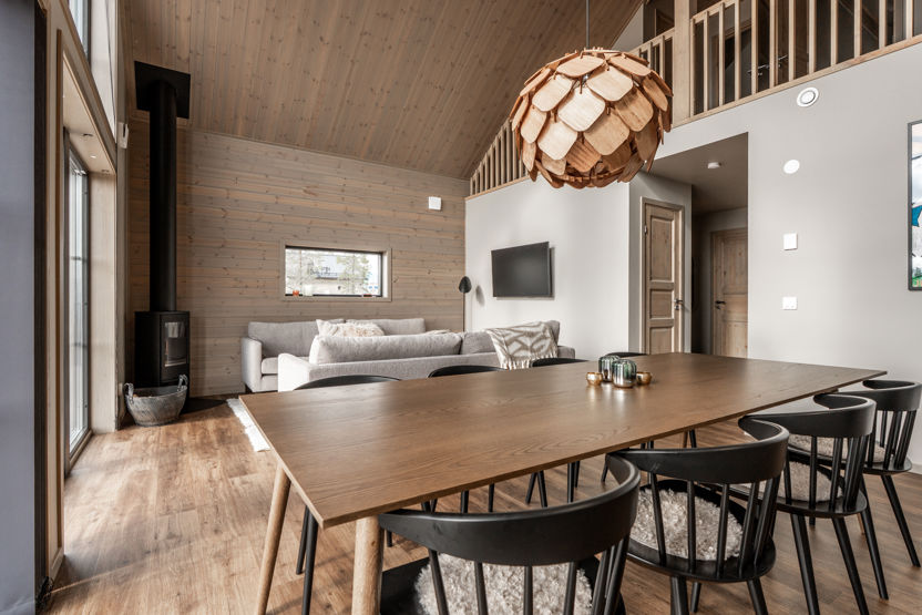 Öppen planlösning med välutrustat kök och matplats. I allrummet finns bekväma sittmöbler och en braskamin som ger extra värme efter en dag ute.